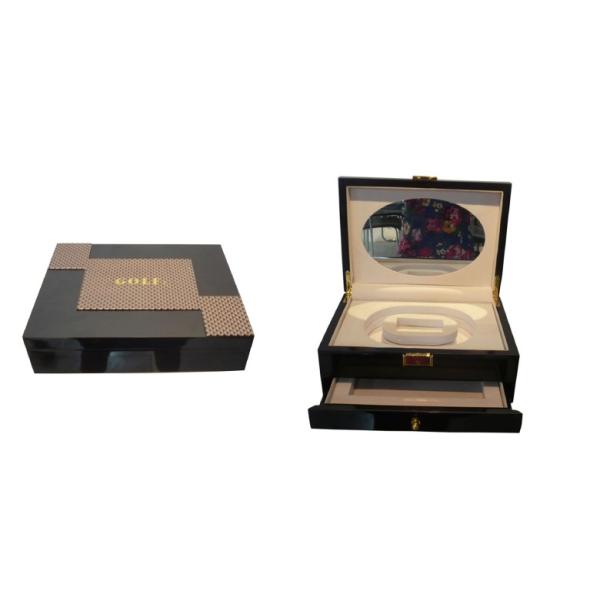 | Material: | plastic board , logo gold. inside mirror,velet lining drawer with metal button | |